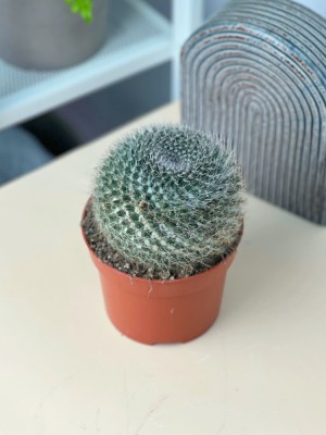 Высота общая: 15 см Диаметр горшка: 10 см Высота растения от горшка: 7 см Освещение: Яркое, переносит прямые солнечные лучи, при хорошем освещении обильно цветёт. Полив: Скудный, по мере полного просыхания почвы. Не любит влажный грунт и длительное нахождение корней в сырости. Почва: Предпочитает рыхлый каменистый грунт, подойдет смесь из небольшого количества торфяного грунта для кактусов и суккулентов, песка, гравия и цеолита (или любого другого разрыхляющего компонента, лавы, перлита, пеностекла). Примечание: Продается в пластиковом транспортном горшке Животные и дети: Имеет крючки на конце иголок, которые могут навредить.