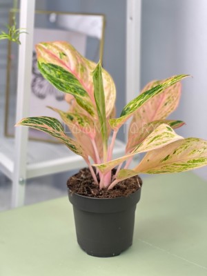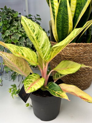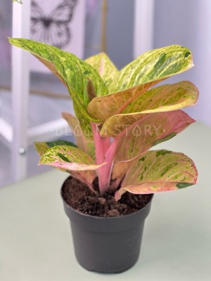 Комнатное растение Аглаонема Шартрез Прити - листья лимонно-зелёные, каждый с уникальным оттенком и узором. Нежно розовые стебли и центральные прожилки.