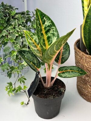 Комнатное лиственное растение Аглаонема Пич Пёрл с персиковыми листьями и ярким зелёным камуфляжным орнаментом. Стебли травянистые, невысокие, розового цвета.
