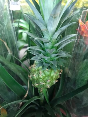 Из Голландии комнатный ананас поставляется уже с плодом, он имеет исключительно декоративную функцию и не пригоден для употребления в пищу. Разные сорта ананаса отличаются между собой размером и расцветкой плода. Маленький ананасик держится на растении до полугода, после чего плодоножка постепенно усыхает и плод отваливается. К сожалению повторного плодоношения в комнатных условиях добиться крайне сложно, требуется опыление с другого растения.