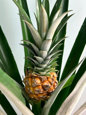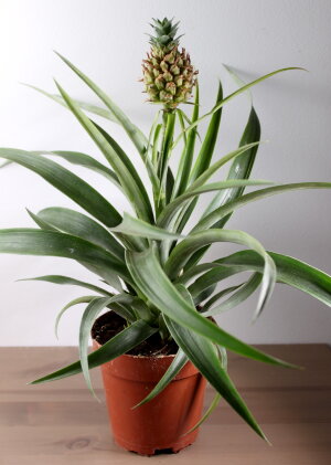 Растение ананас не так давно появился в комнатном садоводстве, но уже завоевал сердца любителей экзотики. Не сложное в уходе тропическое растение предпочитает хорошо освещенное место, длинные жесткие листья сформированы в розетку на них часто расположены небольшие шипы. Цвет варьируется от серо-зеленого до вариегатного ярко-желтого. Зимой для содержания ананаса рекомендуют устанавливать дополнительную досветку.