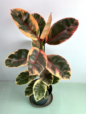 Фикус Эластика Белиз - розовый сорт каучуконосного фикуса, его крупные кожистые листья имеют красивые переливы из тёмно-зелёного в кремово-белый.