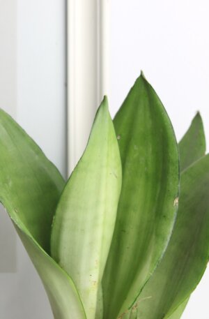 Сансевиерия Трифасциата Муншайн - самый светлый вид с молочно-зелёными листьями. Способна благополучно произрастать в условиях слабой освещенности. В высоту достигает до 60 см от горшка.