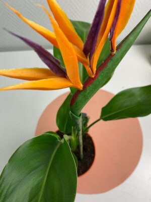 Хохлатая цветочная головка напоминает перья на голове журавля или маленькую птичку в полете, за что Стрелицию часто называют Журавлиным растением или Райской птицей.