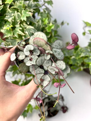 Церопегия - это многолетнее растение родом из тропических лесов Южной Африки, по праву считается одним из самых удивительных растений. Церопегия — это лиана-суккулент. Ее клубневые корни, мясистые стебли и утолщенные листья предназначены для запасания влаги. В природных условиях, клубневое основание лианы, аккумулирующее воду, закрепляется на уступе скалы или в почве и выпускает несколько фиолетовых нитевидных стеблей, способных вырасти до 2-4 метров. Вдоль стеблей с интервалом около 10 сантиметров растут маленькие сочные сердцевидные листочки, имеющие мраморную поверхность светло- и темно-зеленого цвета. Во время цветения из пазух листьев появляются вертикально направленные небольшие цветки, своей необычной формой напоминающие трубочку, размещенную на круглом фиолетовом основании. После цветения на стеблях образовываются бульбочки, которые, при соприкосновении с почвой, способны пускать корни и давать побеги.