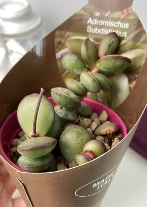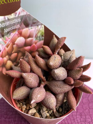 Адромискус - невысокое растение из семейства Толстянковых. Имеет мясистые небольшие листочки цилиндрической или округлой формы в зависимости от вида. Растет некрупным приземистым кустом до 15 см в высоту. Расцетка варьируется от сизо-зелёной до насыщенно-бордовой, листья гладкие или шишковидные. Привлекательно смотрится в группе суккулентов или в качестве одиночно-растущего растения.